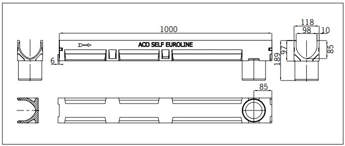Afløbsrende til afvending af flader i f.eks. indkørsel. Renden er uden rist og med lodret udløb. Studsen på udløbet er ø 110 mm.